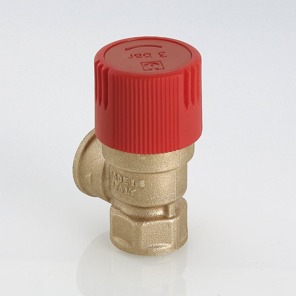 (VT.0490.IG) Клапан предохранительный нерегулируемый, c фиксированной заводской настройкой 1,5/3,0/6 бар (для удобства пользования введена цветовая маркировка: черный колпачок – 1,5 бара, красный – 3, желтый – 6 бар). Обеспечивает защиту от превышения давления водогрейных котлов, бойлеров, сосудов под давлением, систем отопления, напорных трубопроводов сбросом рабочей среды (в качестве рабочей среды может использоваться вода, растворы этиленгликоля или пропиленгликоля и другие жидкости, нейтральные по отношению к материалам клапана) в окружающую среду либо дренажный трубопровод. Максимальная рабочая температура – 115 °С. Предусмотрена возможность ручного открытия клапана предохранительного для проверки работоспособности, профилактики залипания золотниковой обоймы. Резьба присоединения – внутренняя, 1/2".