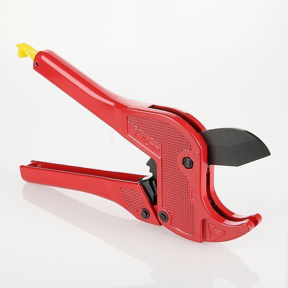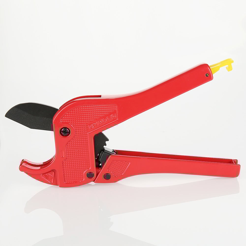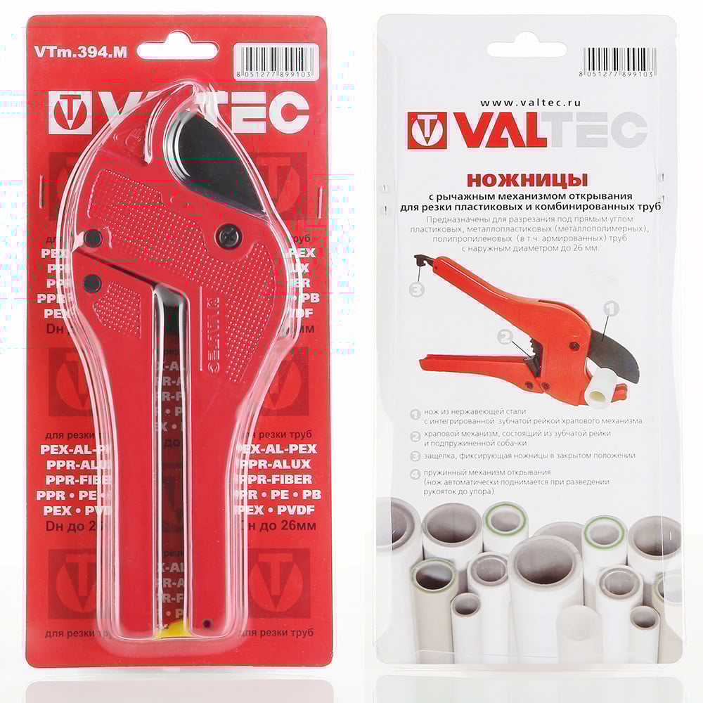 (VTm.394.M) Ножницы с храповым механизмом для металлополимерных и пластиковых труб (до 26 мм) обеспечивают перпендикулярное разрезание трубы без деформации её стенок. Это достигается конфигурацией опорной скобы, поступательным движением ножа, поднятие которого происходит при разведении рукояток. Кроме зубчатого храпового механизма ножницы оснащены лезвием из закаленной стали, рычажным открывающим механизмами, фиксирующей защелкой. Изделие рекомендуются для работы с трубами диаметром до 26 мм.