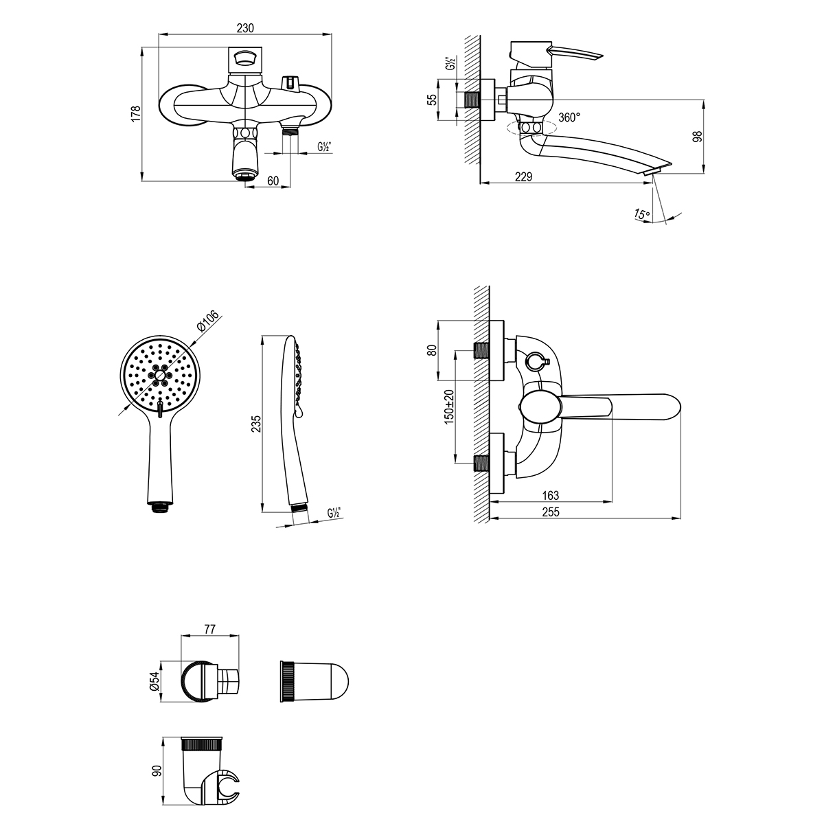 • Аксессуары в комплекте: шланг 1,5 м, 3-функциональная лейка;106х235 мм, настенное поворотное крепление