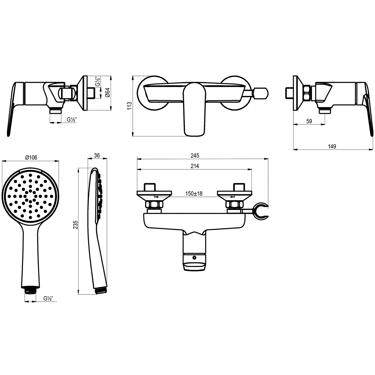 Серия смесителей VERBA. Комплектация: Керамический картридж 35 мм Аксессуары в комплекте: 1-функциональная лейка;106×235 мм, душевой шланг 1,5 м Присоединительная группа для настенного крепления ½” Металлическая рукоятка