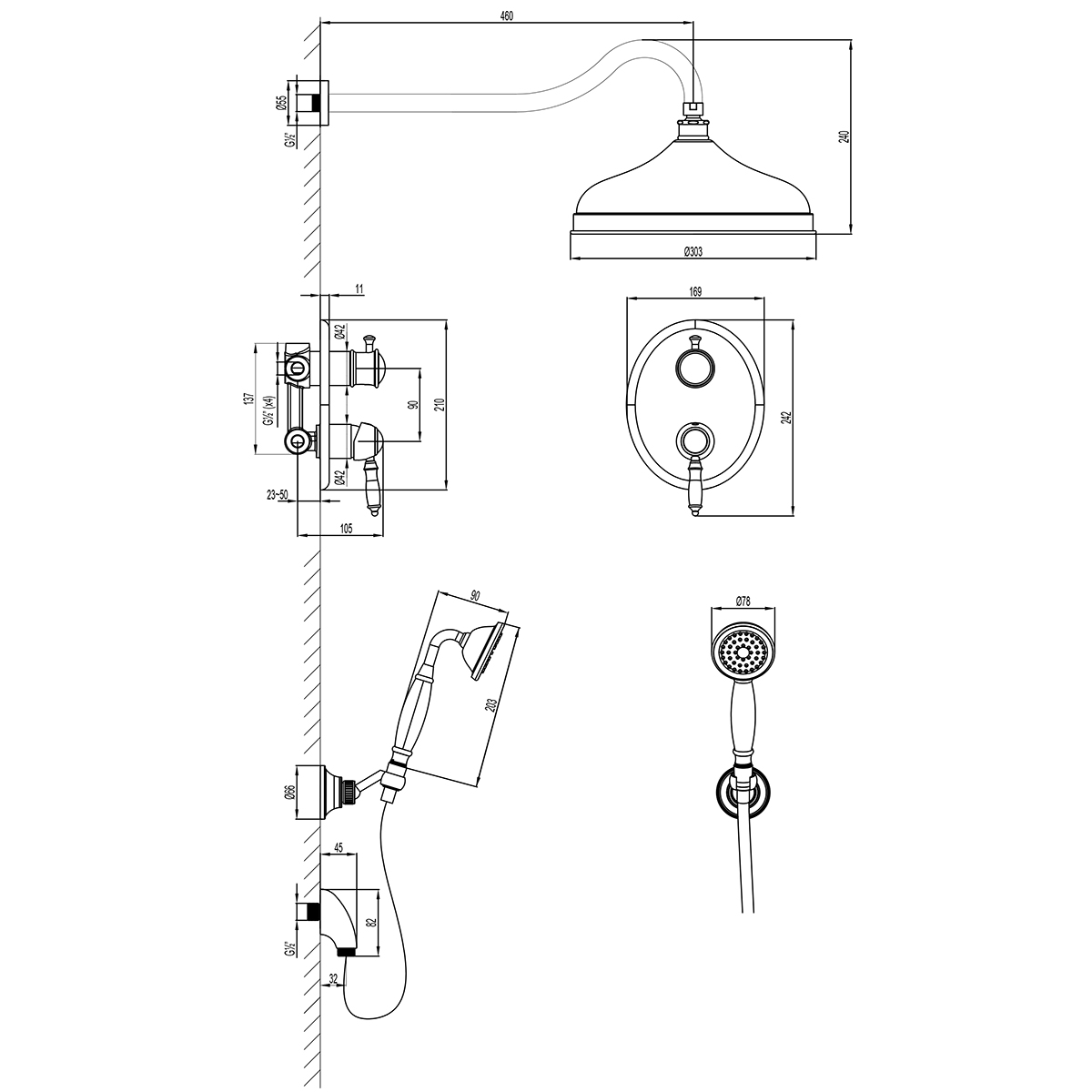 Серия VILLA - благородное обаяние вечных ценностей.Комплектация: Керамический картридж Sedal 35 мм2-позиционный картриджный переключатель (угол поворота – 120°) Верхняя поворотная душевая лейка «Тропический дождь» Ø303 ммДержатель верхней душевой лейки 460 мм1-функциональная лейка Ø78x215 ммНастенное поворотное крепление для лейкиДушевой шланг 2 мПодключение для душевого шлангаМеталлическая рукоятка