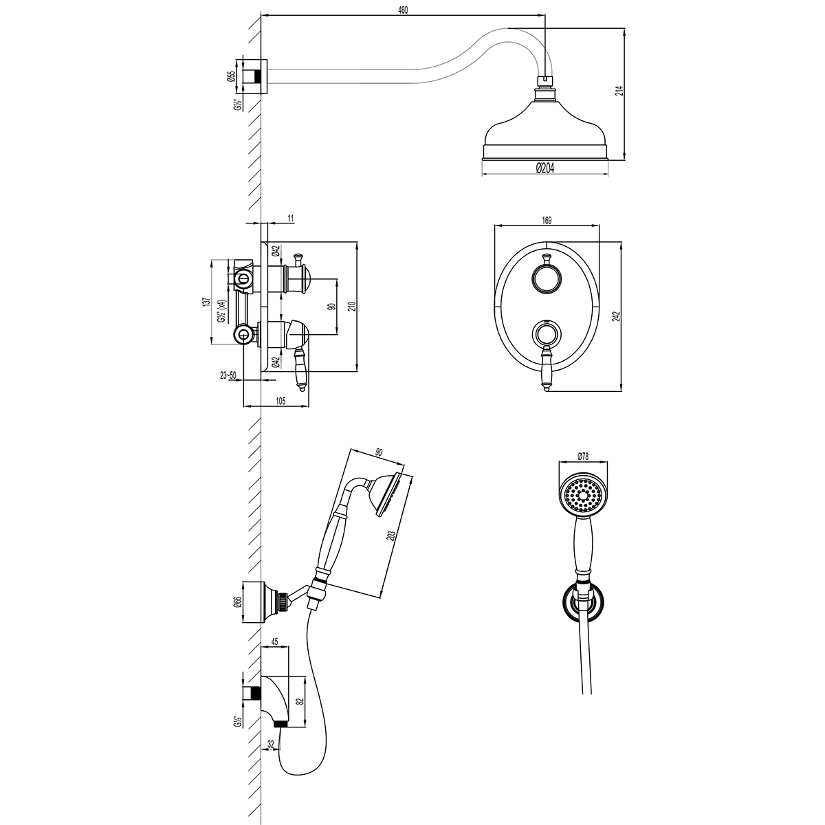 Серия VILLA - благородное обаяние вечных ценностей.Комплектация: Керамический картридж Sedal 35 мм2-позиционный картриджный переключатель (угол поворота – 120°) Верхняя поворотная душевая лейка «Тропический дождь» Ø303 ммДержатель верхней душевой лейки 460 мм1-функциональная лейка Ø78x215 ммНастенное поворотное крепление для лейкиДушевой шланг 2 мПодключение для душевого шлангаМеталлическая рукоятка