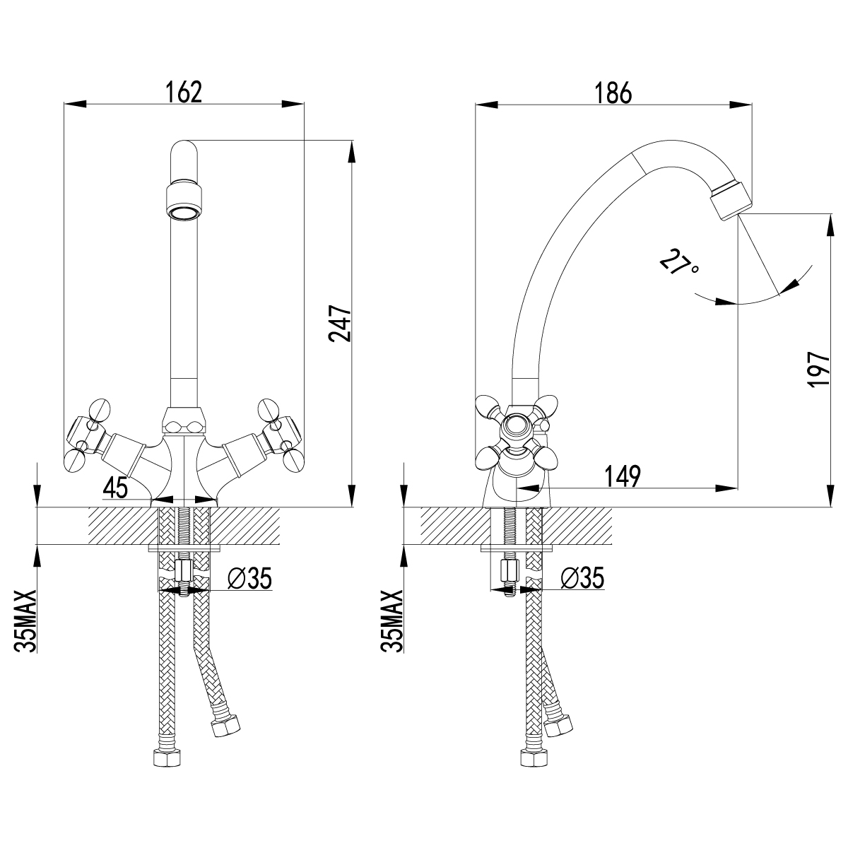 Серия VISTA.Комплектация: АэраторКран-буксы с керамическими пластинами (угол поворота – 90°)Гибкая подводка ½” 35 см Присоединительная группа для настольного крепления Металлические рукоятки