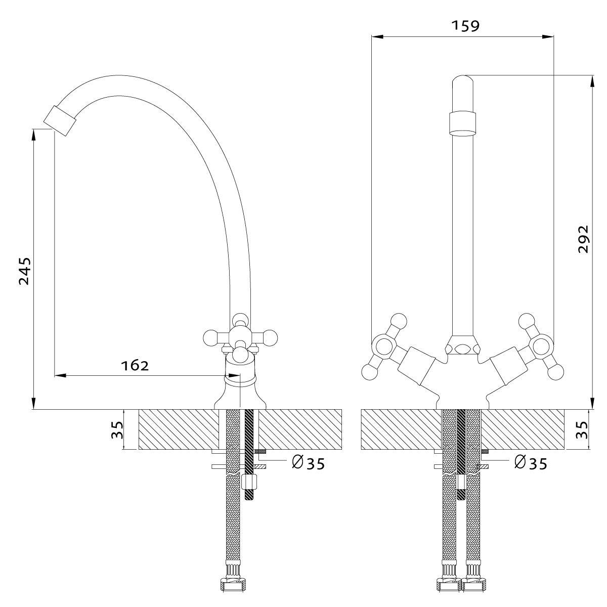 В комплекте: Пластиковый аэратор с функцией легкой очисткиКерамические вентильные головки Гибкая подводка 30 см – 2 шт.Присоединительная группа для горизонтального крепления Металлические рукоятки
