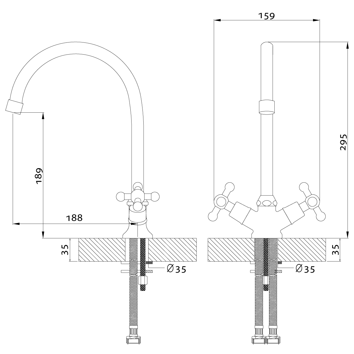 В комплекте: Пластиковый аэратор с функцией легкой очисткиКерамические вентильные головки Гибкая подводка 30 см – 2 шт.Присоединительная группа для горизонтального крепления Металлические рукоятки