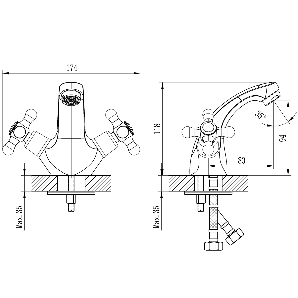 В комплекте: Пластиковый аэратор с функцией легкой очистки Вентильные головки с резиновыми прокладкамиГибкая подводка ½” 35 см – 2 шт.Присоединительная группа для настольного крепления Металлические рукоятки