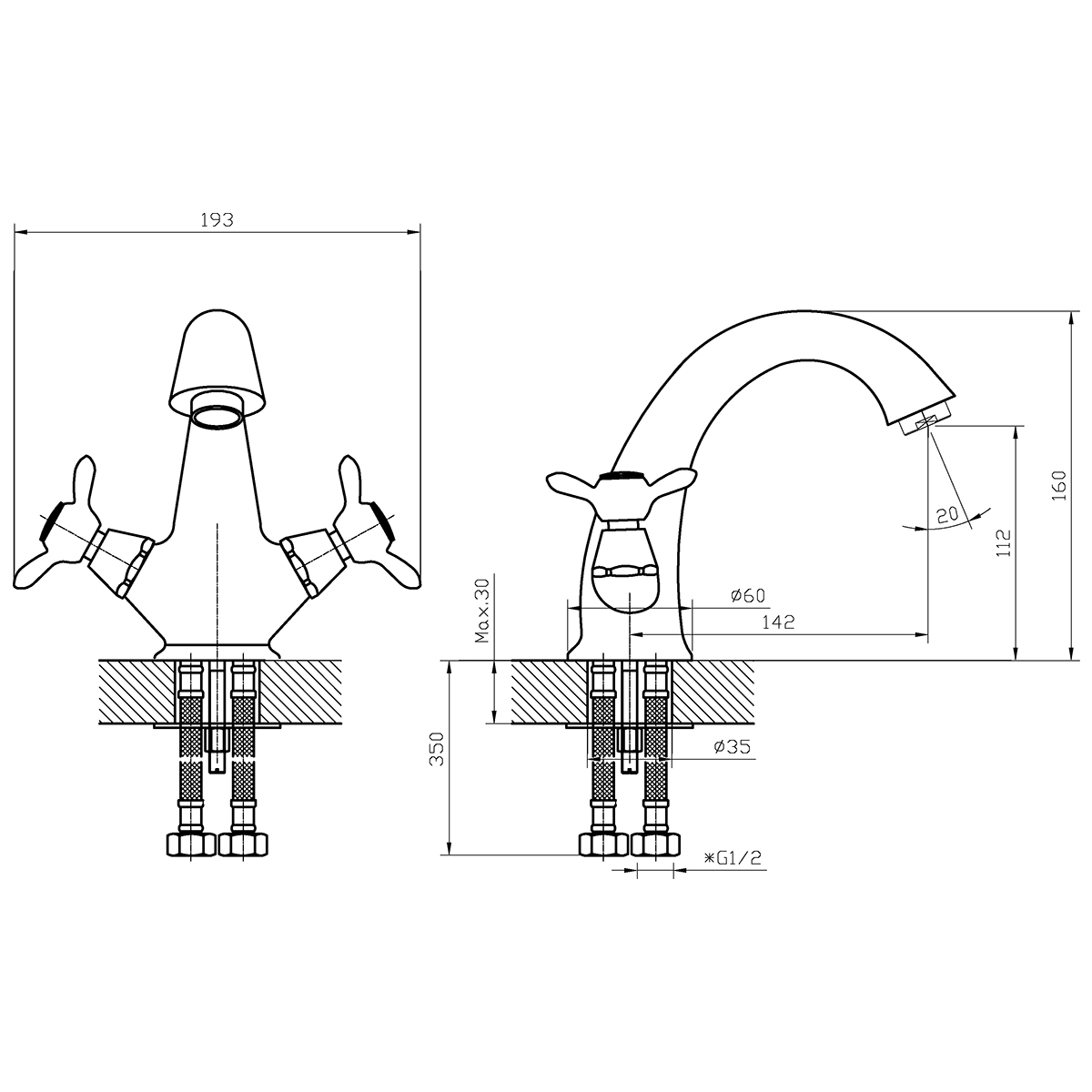 В комплекте: Пластиковый аэратор с функцией легкой очисткиКерамические вентильные головки (угол повортоа - 90°)Гибкая подводка ½” 35 см – 2 шт.Присоединительная группа для настольного крепления Металлические рукоятки
