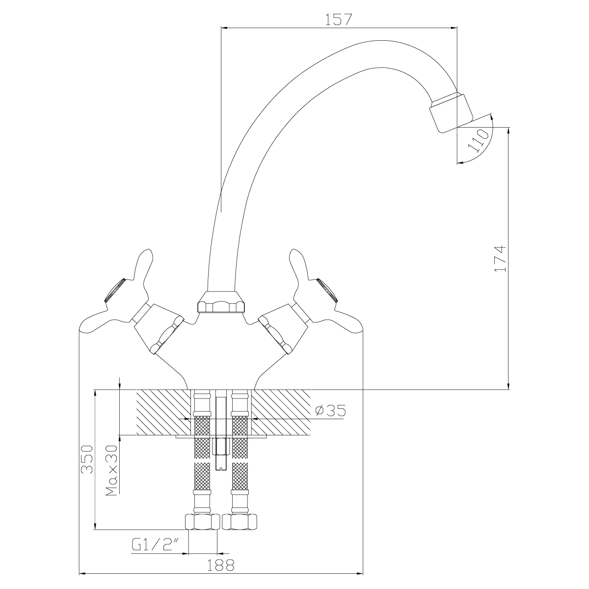 В комплекте: Пластиковый аэратор с функцией легкой очисткиКерамические вентильные головки Гибкая подводка 35 см – 2 шт.Присоединительная группа для горизонтального крепления Металлические рукоятки