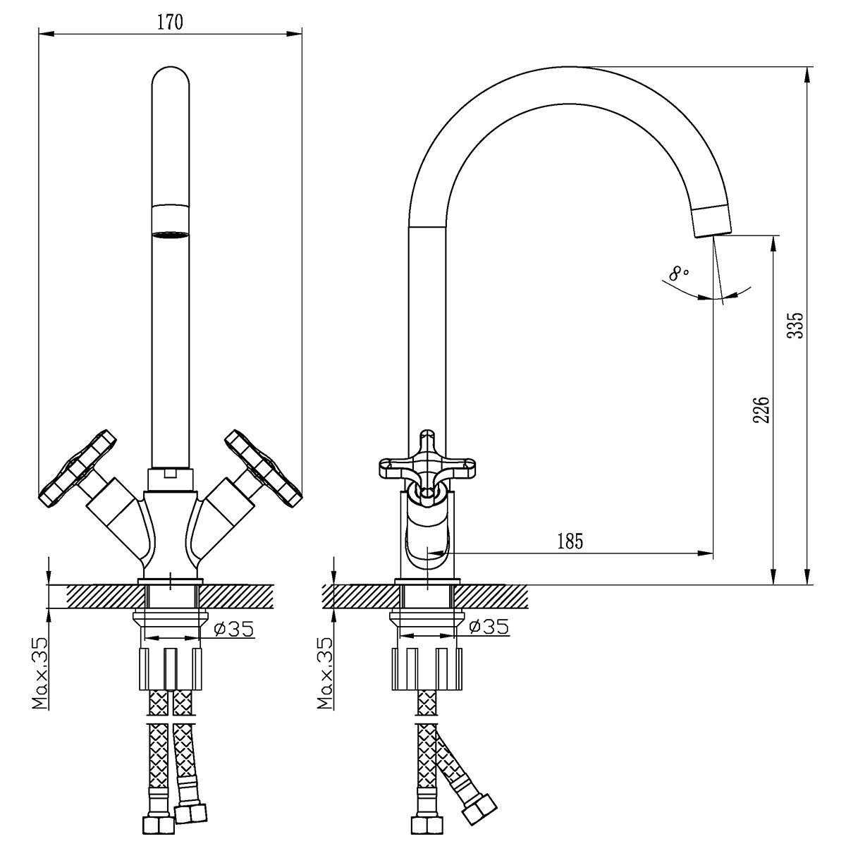 В комплекте: Пластиковый аэратор с функцией легкой очисткиКерамические вентильные головки (угол повортоа - 90°)Гибкая подводка ½” 40 см – 2 шт.Присоединительная группа (гайка) для настольного крепления Металлические рукоятки