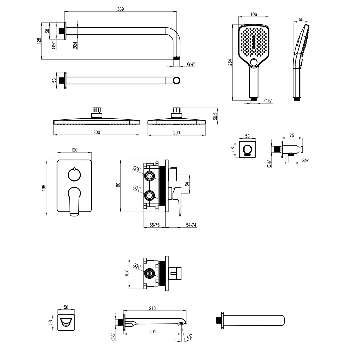 В комплекте:Встраиваемый излив с аэратором с изменяемым углом подачи водыКерамический картридж 35 мм3-позиционный картриджный переключатель (угол поворота – 360°) Верхняя поворотная душевая лейка «Тропический дождь» 300х200 мм Держатель верхней душевой лейки 389 мм3-функциональная лейка 106х264 ммДушевой шланг 1,5 мПодключение для душевого шланга с фиксированным креплением для лейкиМеталлическая рукоятка