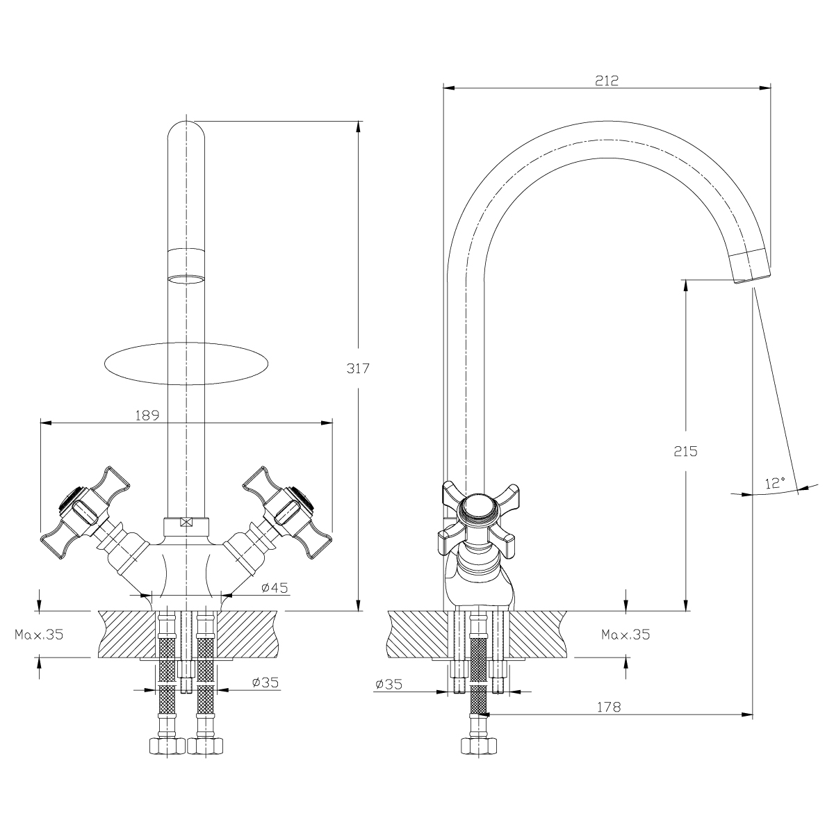 В комплекте: Пластиковый аэратор с функцией легкой очисткиКерамические вентильные головки Гибкая подводка 35 см – 2 шт.Присоединительная группа для горизонтального крепления Металлические рукоятки