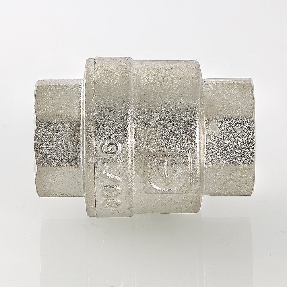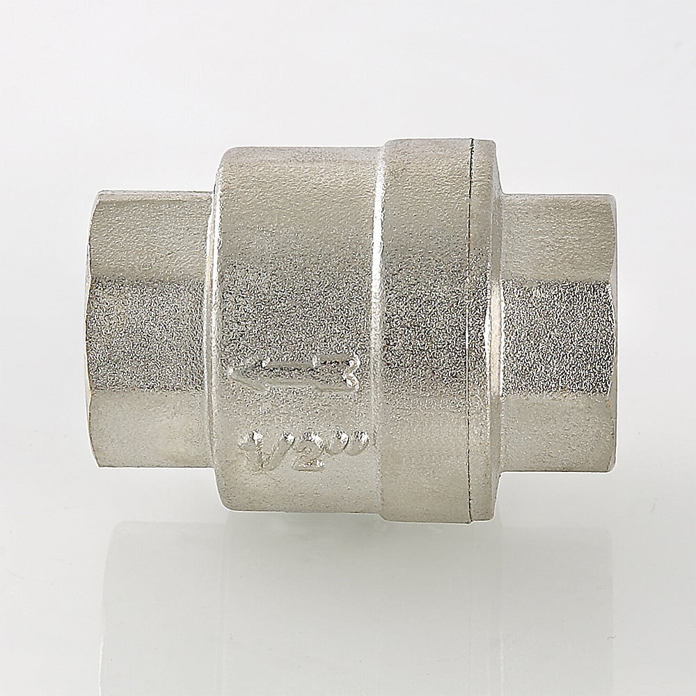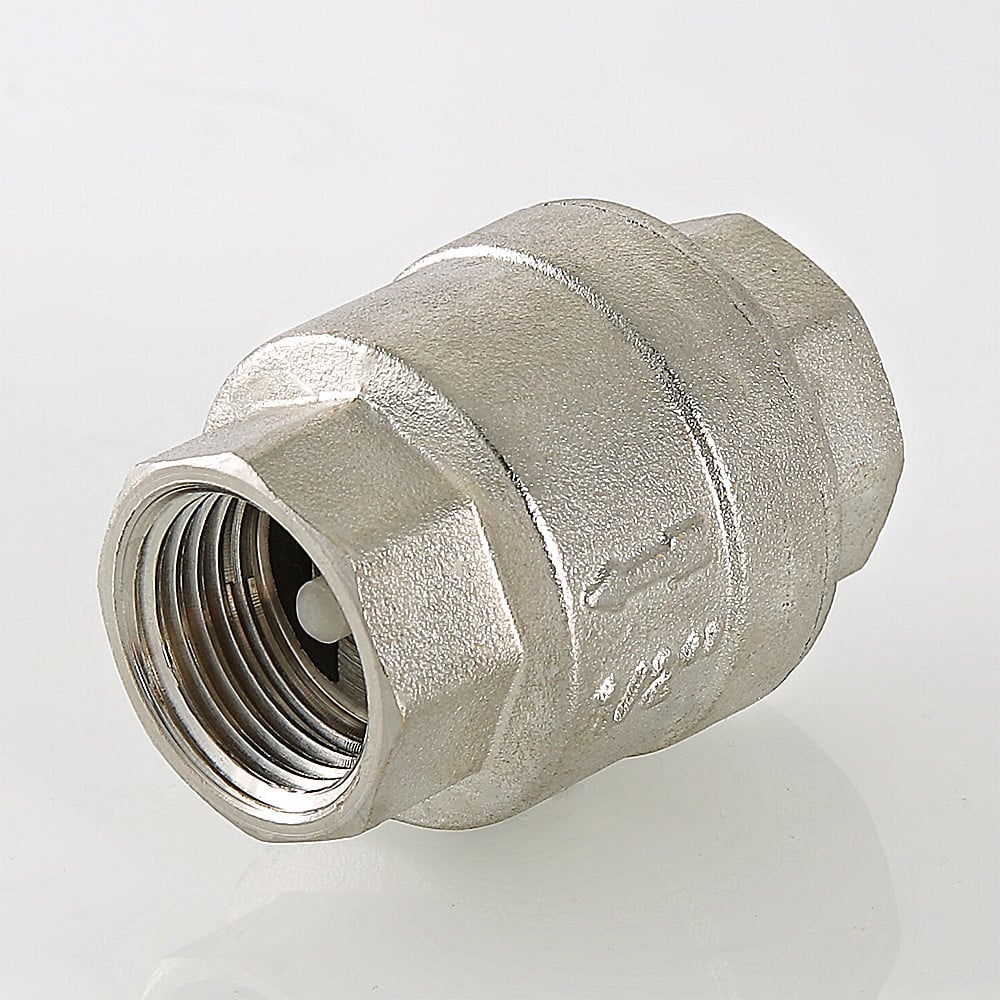 (VT.161.N) Пружинный обратный клапан с золотниковым механизмом (шток, верхняя, нижняя тарелки) из нейлона (стеклонаполненный полиамид), отличающегося механической, термической, химической стойкостью. Материал пружины – нержавеющая сталь AISI 306. Корпус изделия изготовлен способом объемного горячего штампования из высококачественной латуни CW617N (евростандарт EN12165) с нанесением гальванопокрытия (никелирование). Диапазон рабочих температур: –20… +90 °С. Номинальное давление – 25–40 бар (зависит от типоразмера). Резьба присоединения – внутренняя. Направление потока указано стрелкой на корпусе. Данный обратный клапан монтируется в любом положении, трущиеся поверхности отсутствуют.