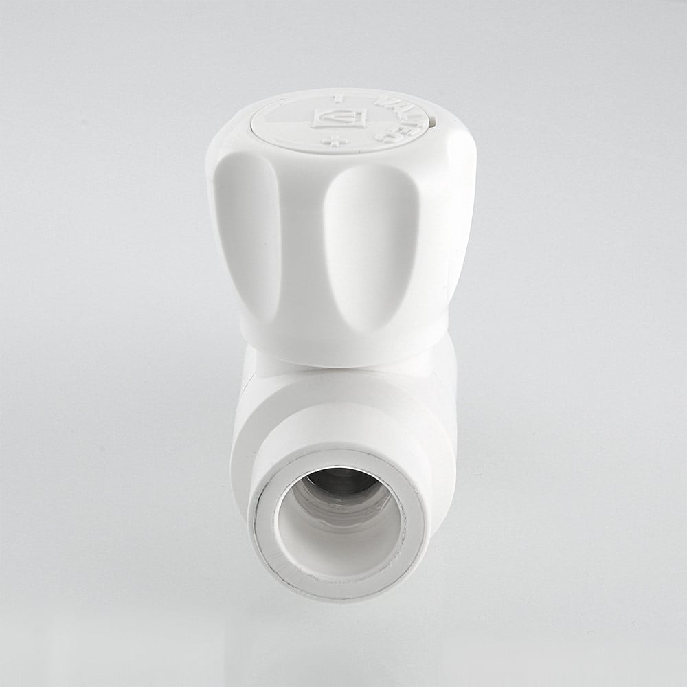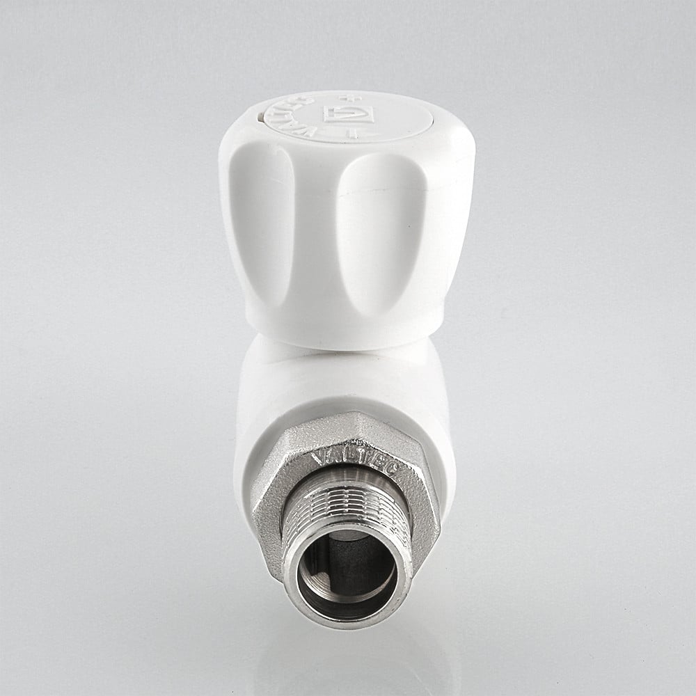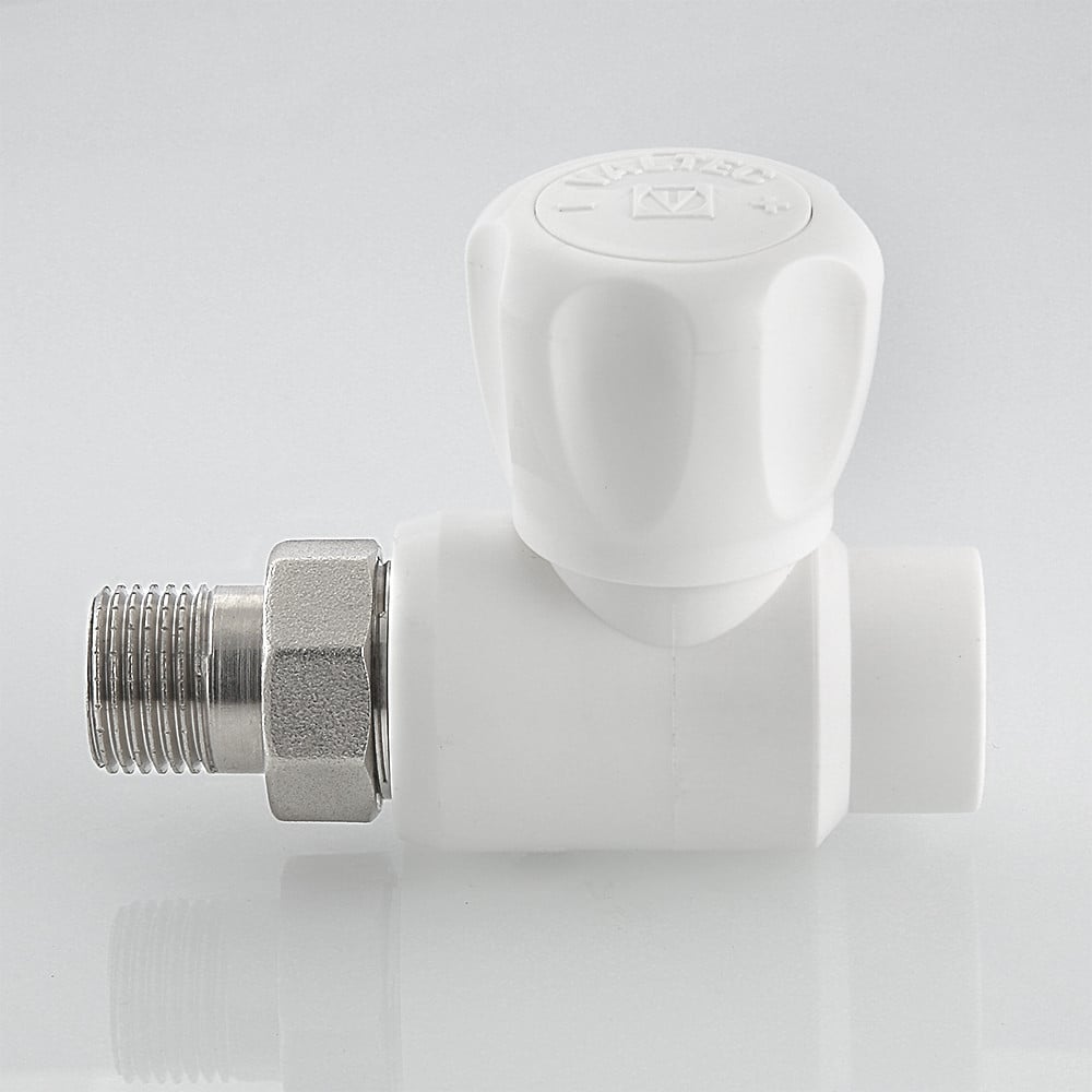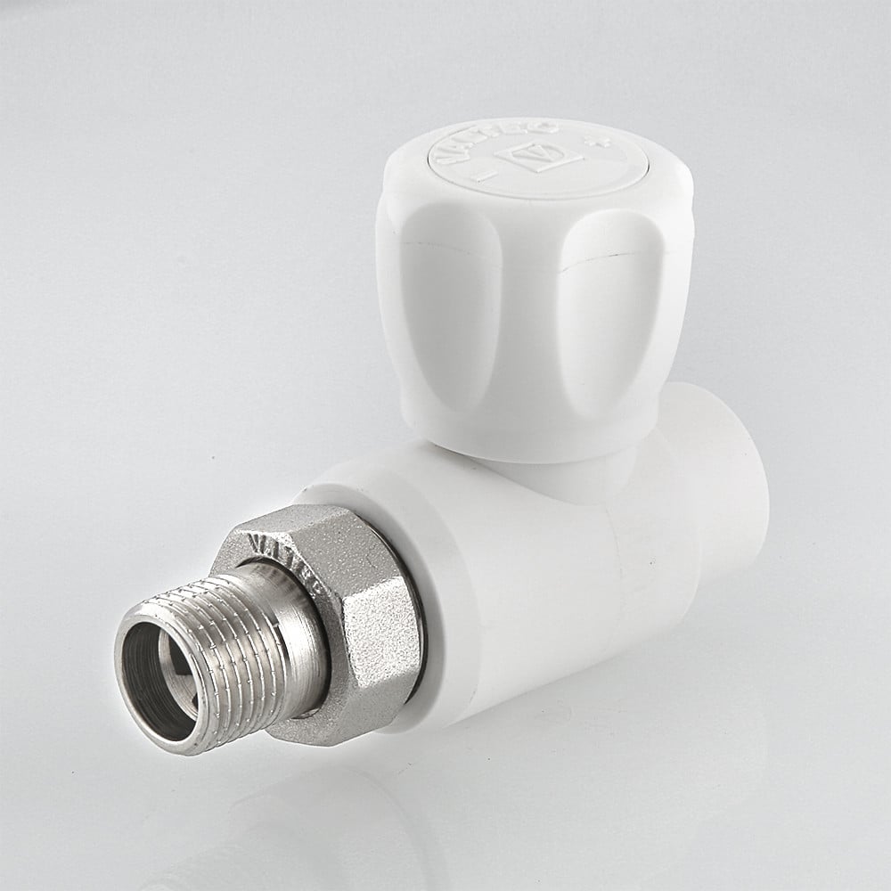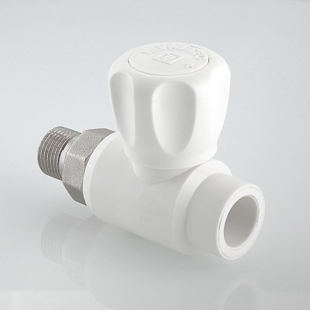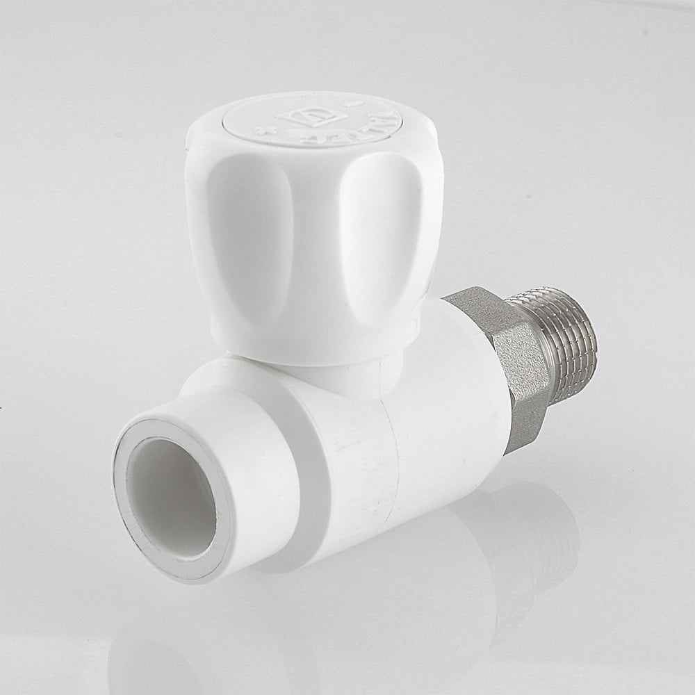 (VTp.717.0) Шаровой кран с полипропиленовым корпусом, прямой. Применяется для подключения к разводке из полипропиленовых труб. Позволяет перекрывать поток теплоносителя через отопительный прибор. Подключение крана производится с помощью латунного никелированного полусгона, закрепленного на закладной детали накидной гайкой. Соединение с трубой – раструбной сваркой. Шаровой затвор и шток крана выполнены из латуни, затвор хромирован. Кран неремонтопригоден. Наработка на отказ – 3 тыс. циклов. Расчетный срок службы – 15 лет. Рабочая температура теплоносителя – до 90 °С, рабочее давление – до 10 бар. Кроме отопления, полипропиленовый кран можно использовать в водоснабжении, включая питьевое, и технологических установках.