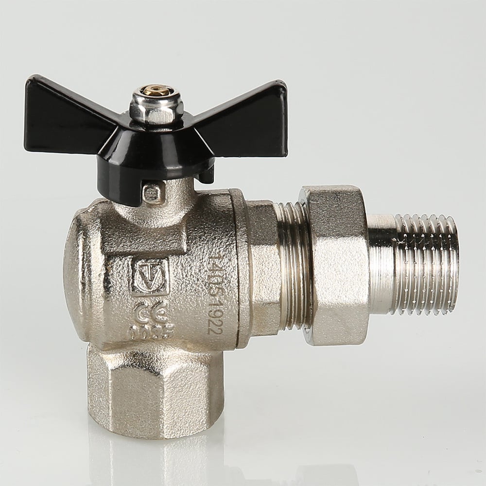 (VT.328.N) Угловой усиленный шаровой кран полного прохода. Рекомендуется к применению в случаях, когда на арматуру возможна передача изгибающих моментов из-за несоосности или температурных деформаций трубопроводов. Материал корпуса и затвора – латунь CW602N, стойкая к вымыванию цинка, седельных колец и сальниковых уплотнений – тефлон с термоприсадками. Ремонтопригодный. Длина резьбы увеличена для создания более плотных соединений. Кран допускается к использованию при температуре до +120 °С (снижение характеристики обусловлено наличием полусгона с уплотнением из EPDM). Тип рукоятки – «бабочка». Модель укомплектована присоединительным полусгоном. Резьба присоединений – внутренняя/наружная.
