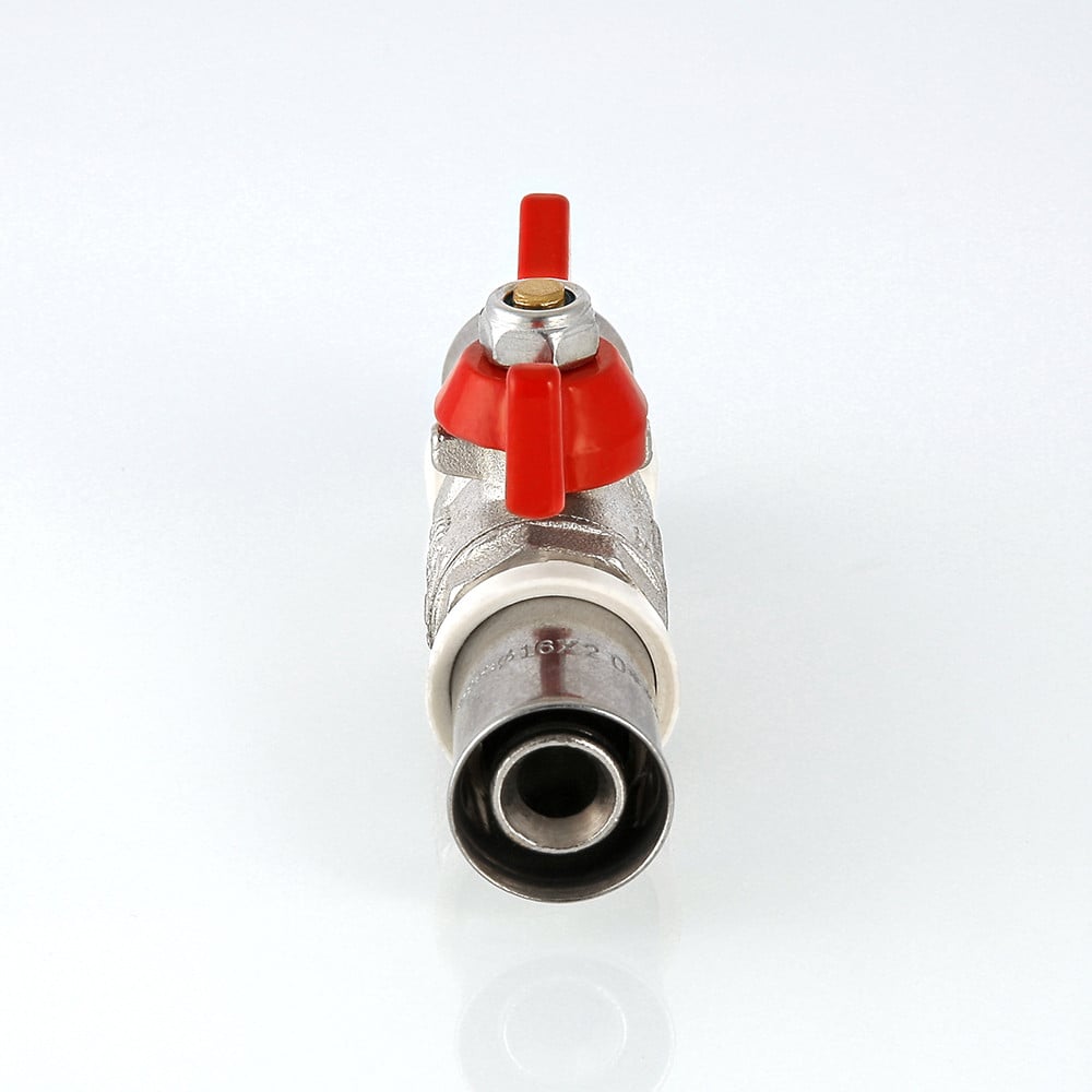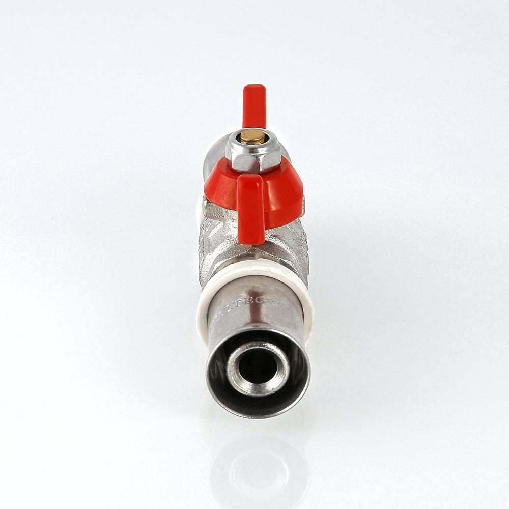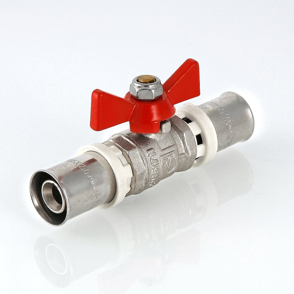 (VT.243.N) Шаровой кран редуцированный (уменьшенного прохода) для использования в составе инженерных систем и технологических установок на основе металлополимерных труб при температуре от –15 до +110 °С и давлении до 10 бар. Неремонтопригодный, с минимальным ресурсом в 4 тыс. циклов. Оснащен ручкой типа «бабочка» из алюминиевого сплава с эпоксидной покраской. Пресс-соединение с металлополимерным трубопроводом – двухстороннее. Не предназначен к применению на стояках, магистральных трубопроводах и участках систем, в которых могут возникнуть изгибающие усилия, передаваемые на корпус крана.